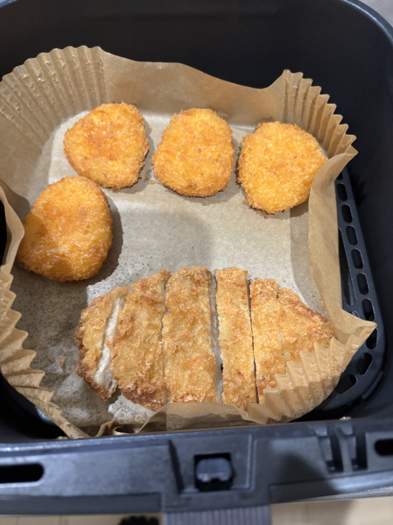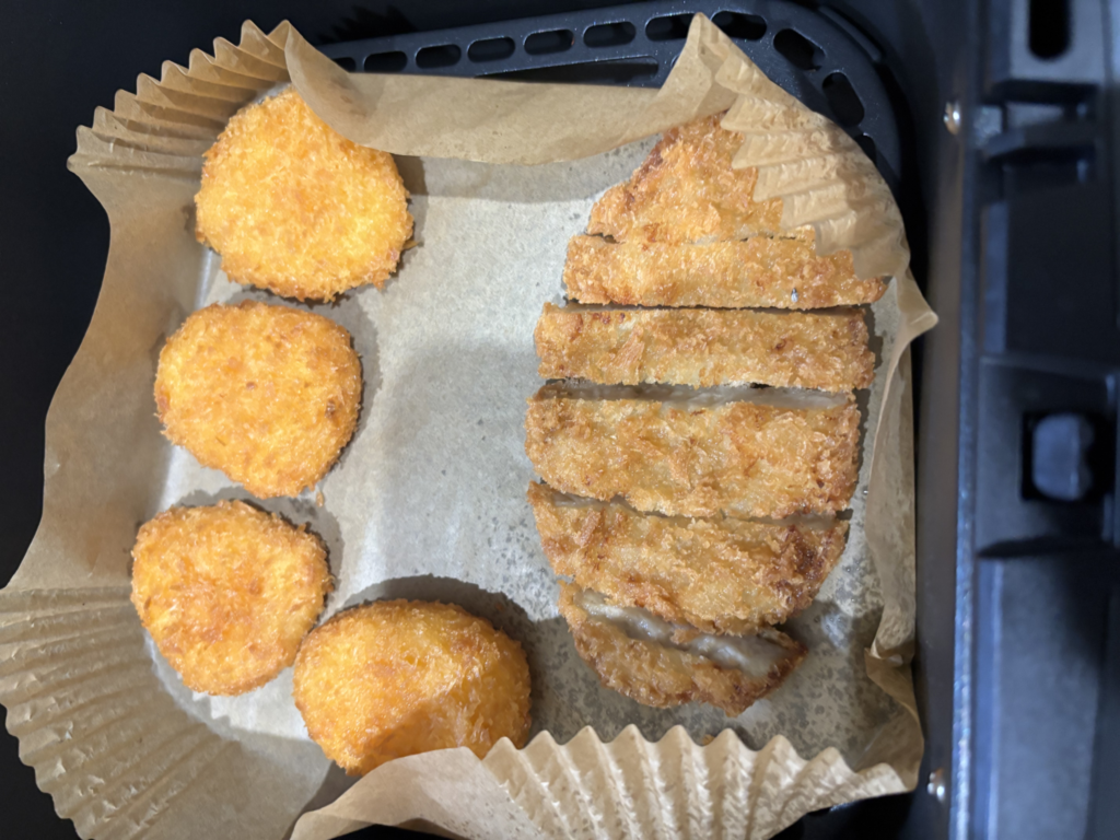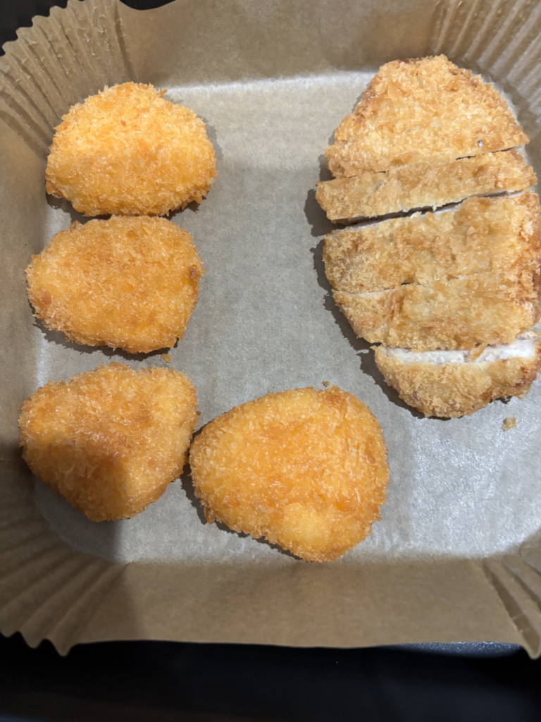 揚げ物は電子レンジで温めると衣がベチャっとしてしまうことが多いですが、ノンフライヤーなら揚げたてのようなサクサク食感が戻るのではないかと思い試してみました。